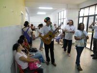 Aos poucos as músicas tocadas e cantadas ficavam mais intensas no corredor que dá acesso à ala de observação do adulto. Quando as portas se abriram, um grupo sorridente tocando instrumentos entrou e começou a interagir tanto com os pacientes quanto com os acompanhantes. "Nossa, achei muito lindo e até participei com eles. É muito bom em uma hora tão tensa e triste como essa, poder espantar os males por meio dessas músicas agradáveis. Uma forma de aliviar a dor e até esquecer por alguns momentos que estamos no hospital", relata a acompanhante Maria Auxiliadora, 61 anos.
